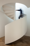 Contemporary sophisticated minimalist residential house interior sculptural staircase with natural wood